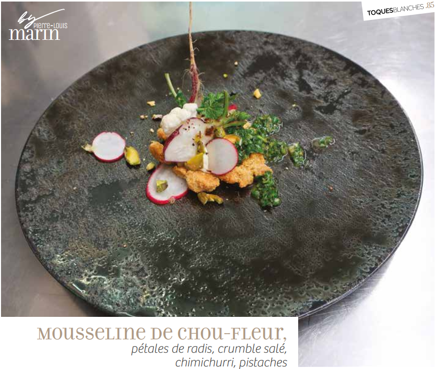 Mousseline de Chou-fleur, Pétales de Radis, Crumble Salé, Chimichurri, Pistaches